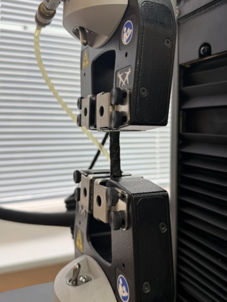 Исследование физико-механических свойств полученного материала на разрывной машине. Автор фото: Александр Гервальд, доцент кафедры химии и технологии высокомолекулярных соединений имени С.С. Медведева РТУ МИРЭА