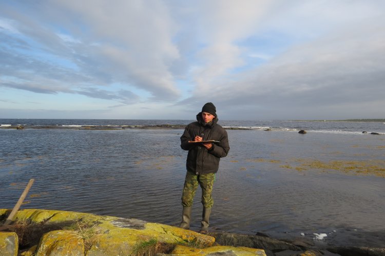 Научный сотрудник лаборатории геологии и геодинамики докембрия ИГ КарНЦ РАН Олег Максимов на острове Столбиха – одной из ключевых локаций по теме изучения эклогитов. Фото из архива Олега Максимова